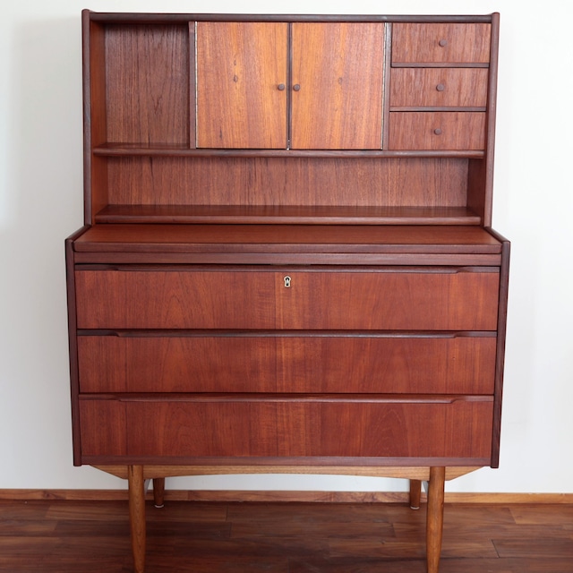1970年代に製作されたデンマーク製のミドルサイズのビューロー。 中央上部の観音開きの扉の内部にはミラーが付いており、簡易なドレッサーとしても利用できます。小さな収納が3杯、大きな収納が3杯、またオープン収納。デスク、ドレッサー、収納、飾り棚と一台で複数の役割を持つ家具です。 ワークスペースとしても活躍しますので、年齢性別を問わず長く相棒となってくれそうなヴィンテージです。 【リペア箇所】 ■全体的なリペア・オイル塗布等を施しています ■天板上部に欠けがあり、チーク材で補修・補色(画像⑯)しています。 ■引き出しの底板を一部新しいものへと交換しています。 【コンディション】 ■全体的に良好なヴィンテージコンディションです ■ミラーの端にやや経年の色染みがあります。 素材: チーク材/オーク材(脚) サイズ: 幅890×奥行440×高さ1200(天板まで:740)(mm)