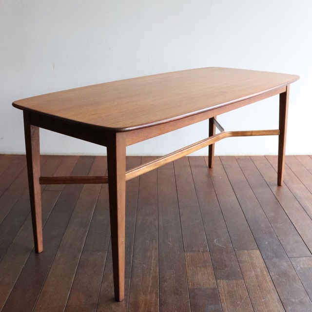 1970年代頃、デンマークで製作されたコーヒーテーブル。リムの立ち上がりと独特な形状の脚が目をひくデザインです。 天板は四辺はチークの無垢材で製作されており、サイドには滑らかな筆返しを擁したデザインです。脚部は構造とデザインを兼ねたフォルムで、あまり見かけないようなデザイン性の高いアイテムとなります。 【リペア箇所】 ■全体的なリペア・オイル塗布等を施しています 【コンディション】 ■天板に小さな凹凸が数か所あります。そのほかは全体的に良好なコンディションで、美観を大きく損ねるようなダメージは無いように思われます。 素材: チーク材 サイズ: 幅1520×奥行530×高さ510(500)(mm)