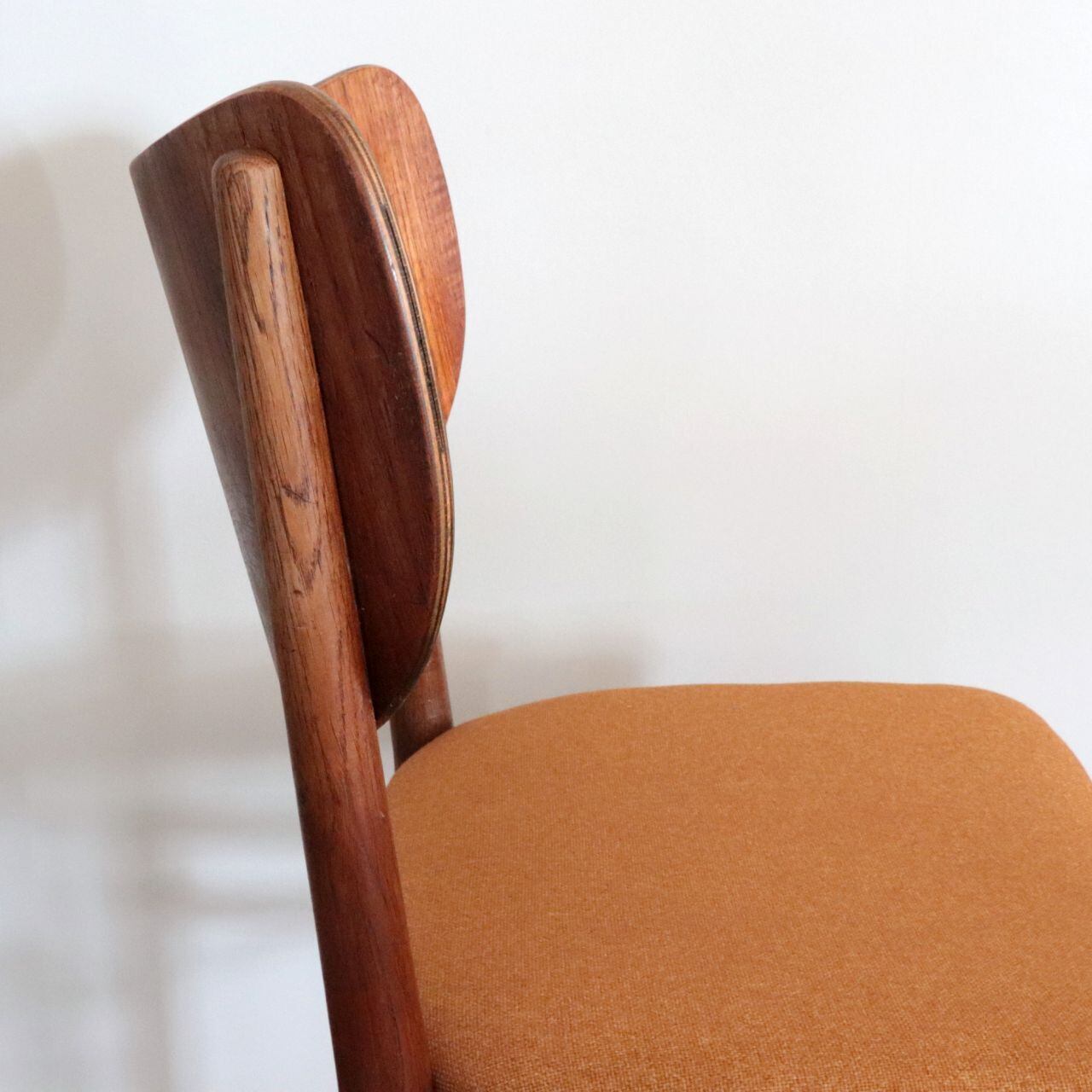 1960年代頃、デンマークで製作されたチェア。大きな背板が体をしっかりとホールドしてくれる座り心地の良いフォルムです。足元は珍しい形状ですがスポークが2重となっており、デザイン性とともにより高い強度を持つ構造となっています。