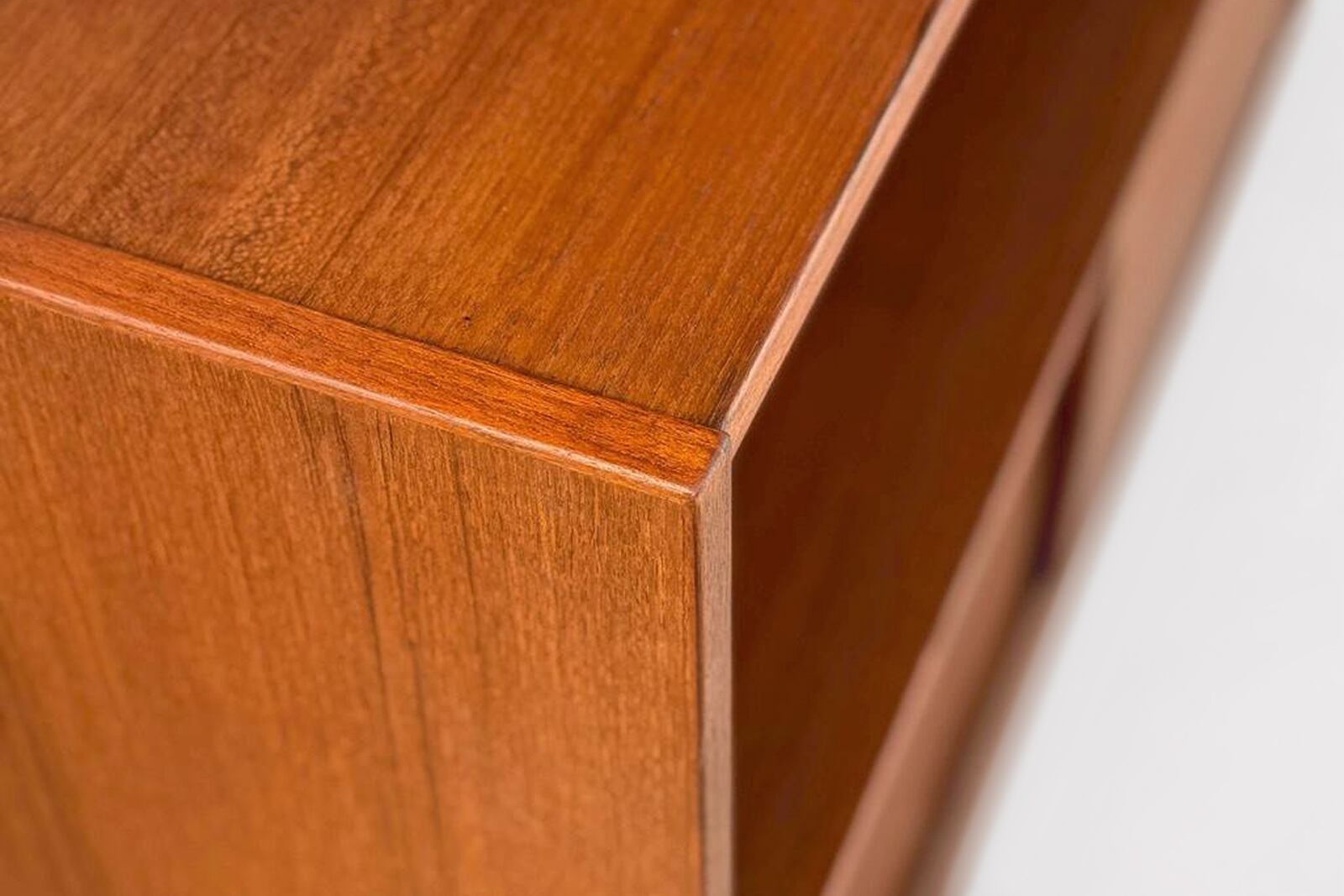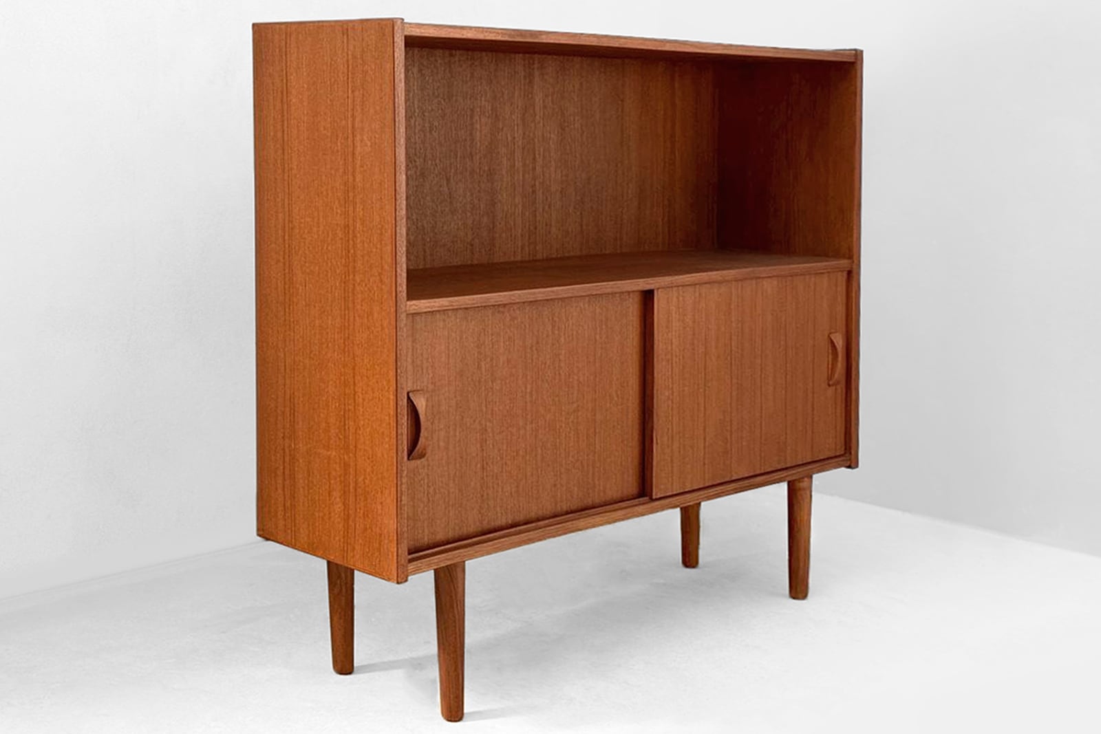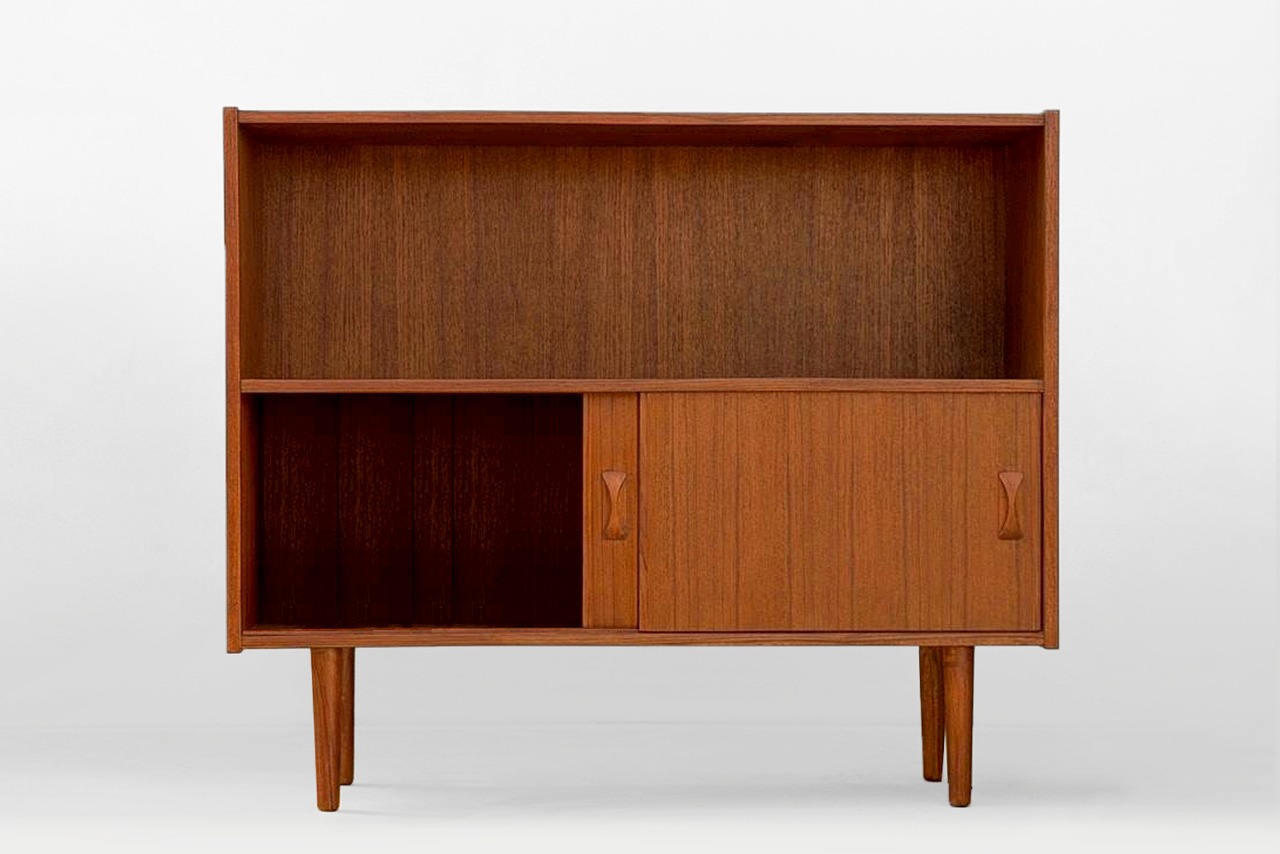北欧デザイン家具Klokken(クロッケン)ディスプレイキャビネット。奥行は27cmと浅いのが特長で、圧迫感なくお部屋に置くことができます。オープンスペースには食器や本、雑貨などを自由なレイアウトで飾ることができ、引き戸の中には生活感の出やすい物をすっきりと収納できます。シンプルなデザインですが、リボン型の取っ手がポイントになっており、チーク材の美しい表情に高級感があります。また引き戸のレールをチーク材にすることで開閉時の音がやさしく、使うほどに素材の心地よさを感じられます。細部にまで北欧ミッドセンチュリー家具の思想を落とし込み、素材・構造ともにこだわって作り上げた、使い勝手の良いキャビネットです。
