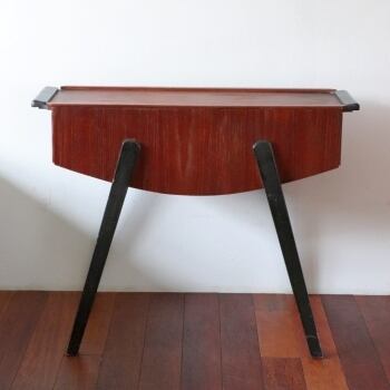 1960年代頃、デンマークで製作されたソーイングボックス。デザイン的に特徴のあるフォルムで、天板を引き出すと内部から収納が出てくる構造です。 もともとは名前の通り刺繍用として製作されチェアの横などに置いて使ったものと思われますが、サイズバランスからソファサイドに置いてテーブル兼収納として、 また空いたスペースでお部屋の印象をデザインするような使い方も良さそうです。ご自宅用はもちろん、店舗様でのご利用も面白そうです。