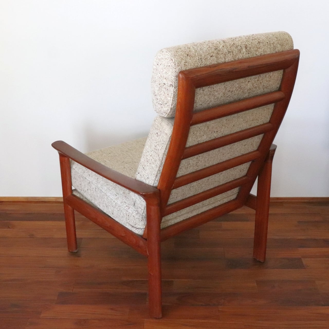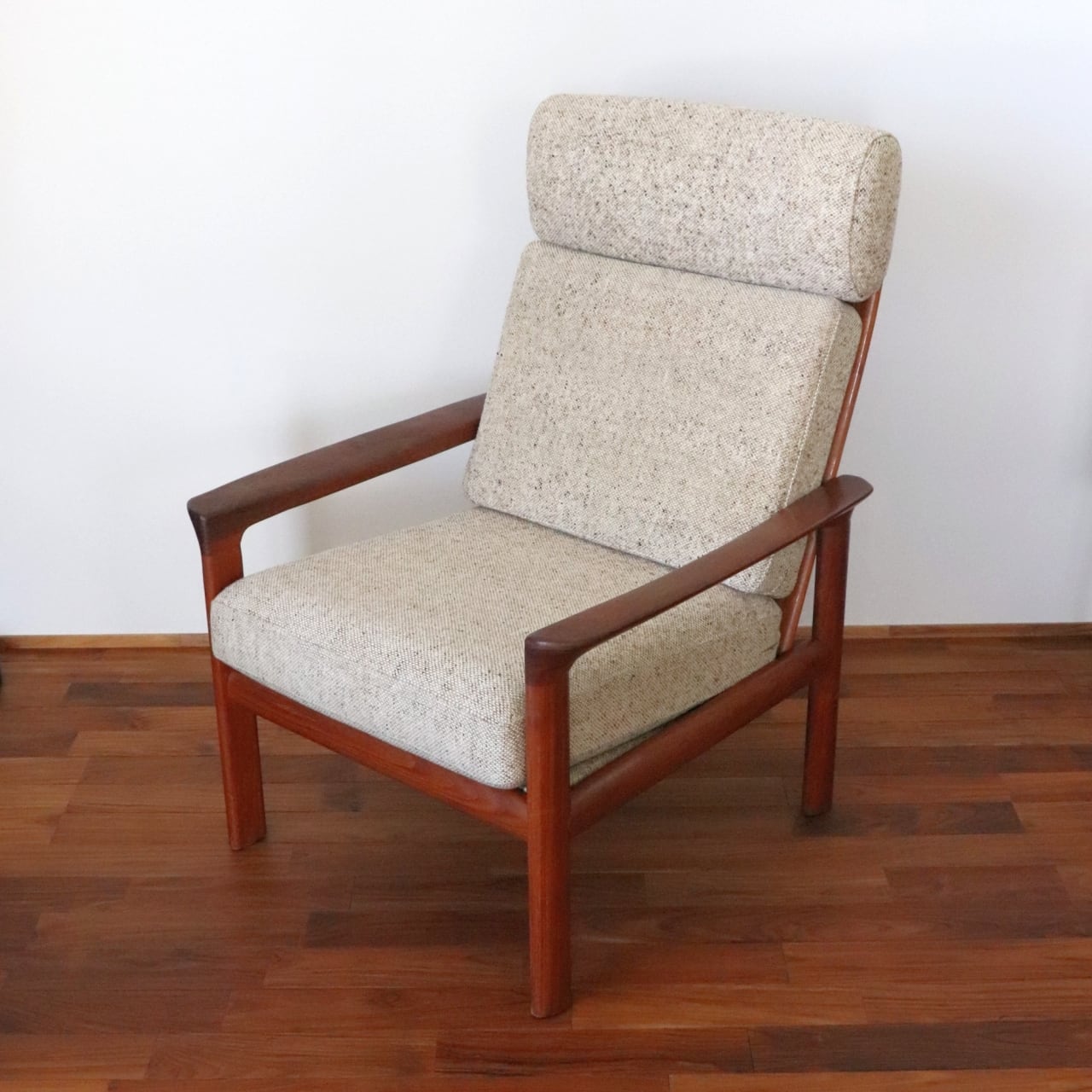 1960年代頃にデンマークで製作されたハイバックチェア。無垢材を贅沢に厚手に使用しており、腕のカービングなど北欧ミッドセンチュリーらしい芳醇なデザインをしています。