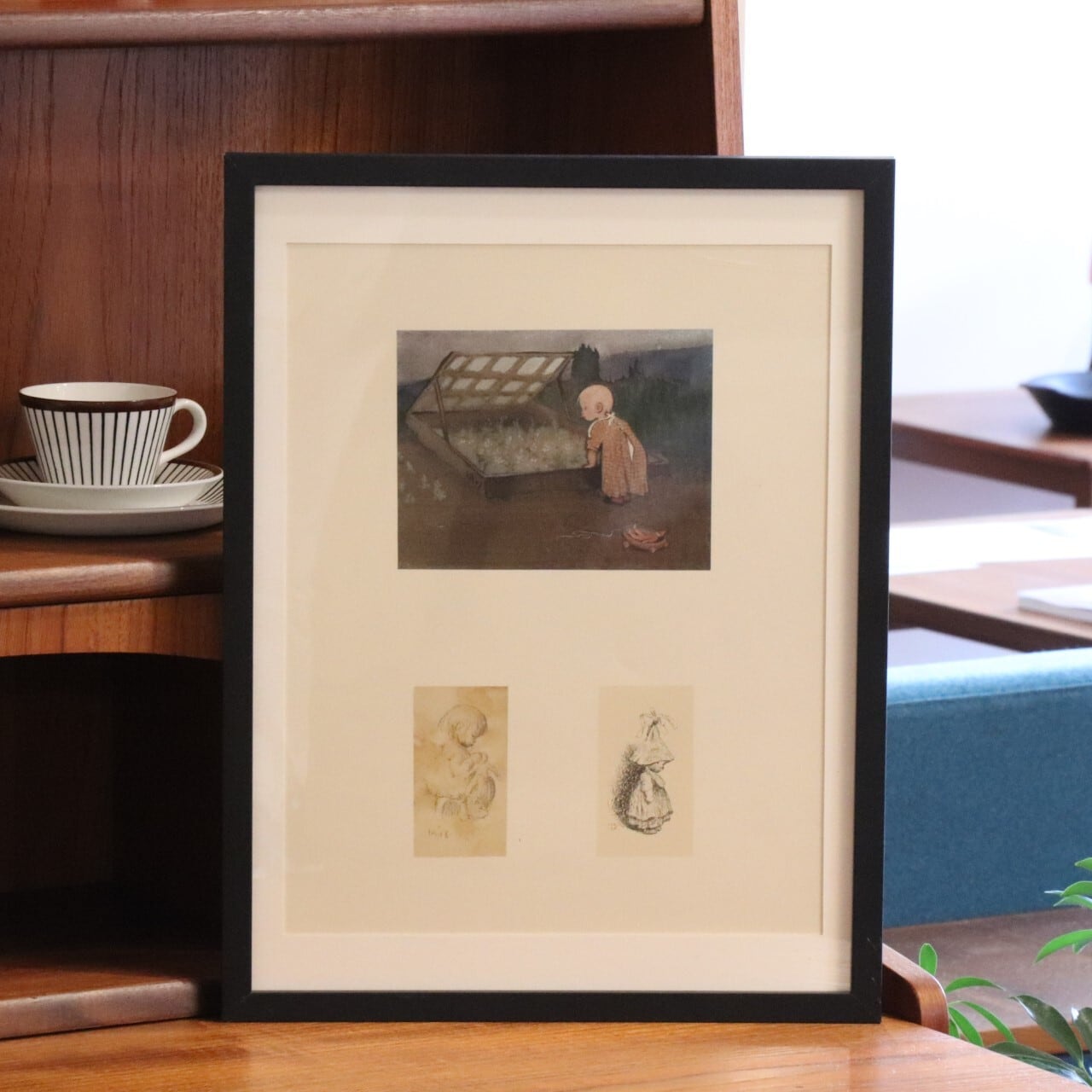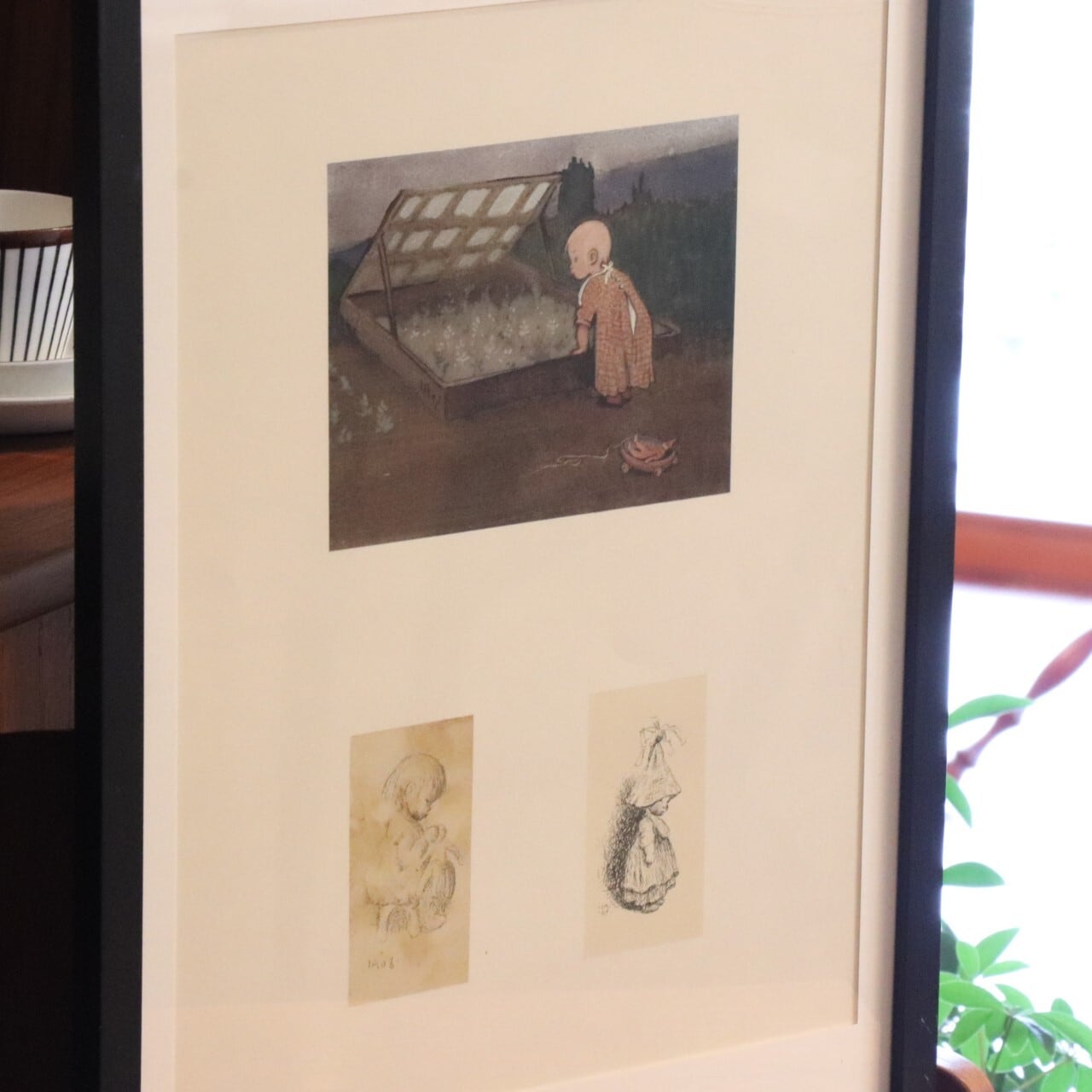 絵はそれぞれLillan vid en drivbänk (上):流木のベンチに座るリッラン/Lillan i Pappersstrut(左下):ペーパーコーンとリッラン/ Dockans toilette(右下):人形のトイレ と題名が付けられています。後に絵本の主人公となるアロセニウスの愛娘リッランを描いた連作です。
